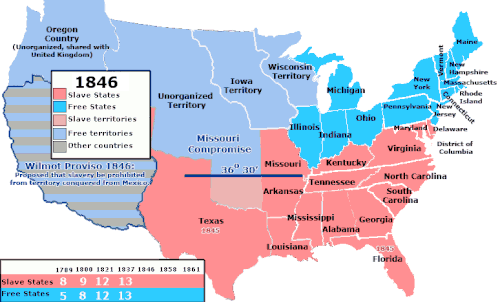 - 8 de agosto: En Estados Unidos, el Compromiso de Misuri en 1820 había autorizado la esclavitud en los Estados al sur del paralelo 36, los Estados esclavistas. En 1846, la Enmienda Wilmot intenta prohibir la introducción de la esclavitud en los territorios conquistados a México.[46] La Enmienda fue aprobada en la Cámara de Representantes, donde los nordistas abolicionistas eran mayoría, pero fue desechada en el Senado, donde los sudistas esclavistas eran más fuertes.[47]