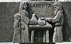 Al cabo de un tiempo, Elías experimentó la misma sequía que el pueblo de Israel, secándose el arroyo cercano a donde vivía, el wadi Cherith (véase Versículo 3), por lo que Dios lo envió a la región de Sidón, en la costa de Fenicia (actual Líbano), patria de la reina Jezabel, y centro del culto a Baal (cf. 1 Reyes 16:31).[6][16] Para que Elías encontrara allí una viuda que le diera de comer, pidió al azar agua y luego pan a una mujer a las puertas de Sarepta. Cuando ella afirmó, 'vive Yahvé tu Dios', que ella y su hijo se estaban muriendo de hambre, Elías repitió su deseo, pero añadiendo las palabras tranquilizadoras, 'No temas', y una profecía de un suministro interminable de comida, que sucedió tal como Elías había dicho.[6]