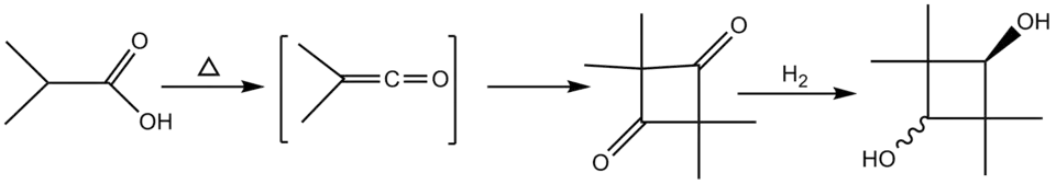 La síntesis del 2,2,4,4-tetrametil-1,3-ciclobutanodiol implica la pirólisis de anhídrido isobutírico seguida de la hidrogenación de la 2,2,4,4-tetrametilciclobutanodiona resultante.[6] En la actualidad, el método empleado para producir este diol sigue este esquema. En un primer paso se convierte el ácido isobutírico, o su anhídrido, en cetona. A continuación, esta se dimeriza para crear un anillo de cuatro miembros con dos grupos cetona, que después se hidrogena formándose el diol. Este último paso se lleva a cabo por hidrogenación catalítica con catalizadores de rutenio, níquel o rodio. La hidrogenación del anillo de dicetona da como resultado ambos isómeros, cis y trans. El procedimiento de producción de este diol se puede esquematizar de la siguiente manera:[7][8]