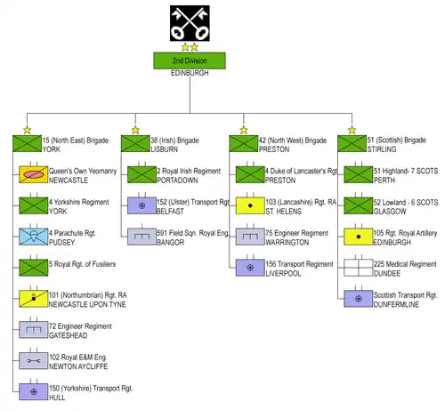 La sede de la división controlaba la Catterick Garrison y cuatro Brigadas Regionales: