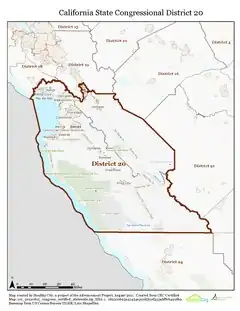 El 20.º distrito congresional se encuentra ubicado en las coordenadas 36°22′24″N 121°16′31″O / 36.3732865, -121.2752181.