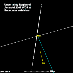 - ↑ a b Steve Chesley, Paul Chodas and Don Yeomans (9 de enero de 2008). «2007 WD5 Mars Collision Effectively Ruled Out - Impact Odds now 1 in 10,000». NASA/JPL Near-Earth Object Program Office. Archivado desde el original el 11 de enero de 2008. Consultado el 9 de enero de 2008. (inglés)
