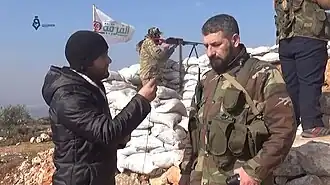 ![]() Combatientes de la 23.ª División, liderados por el coronel Abu Mustafa, durante la operación militar turca en Afrin en febrero de 2018. La bandera del grupo se puede ver en el fondo. | ||