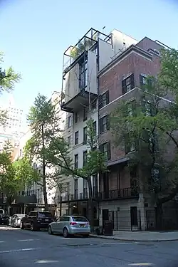 En la fachada oeste, hay tres ventanas en cada uno de los pisos segundo al quinto. Las ventanas del segundo piso constan de nueve sobre nueve ventanas, y la parte inferior de cada ventana está cubierta por una pequeña baranda metálica decorativa. Los pisos tercero a quinto tienen ventanas de guillotina doble con alféizares debajo. Sobre cada una de las ventanas del tercer piso hay grandes piedras angulares, que se extienden hacia arriba hasta una cornisa festoneada que corre justo debajo del cuarto piso. La ventana central en cada uno de los pisos tercero al quinto tiene una unidad de aire acondicionado debajo.[7] En la fachada este del primer al quinto piso, hay balcones que se extienden por todo el ancho de la casa, con vista a FDR Drive. La parte este de la fachada sur en los pisos cuarto y quinto es visible desde el sureste, con pequeñas ventanas rectangulares en estos pisos.[11]