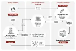 - Dominio de interoperabilidad (la infraestructura proporcionada por el esquema de tarjeta, crédito, débito, prepago u otro tipo de tarjeta de pago, para soportar el protocolo 3-D Secure). Incluye Internet, el complemento comercial, el servidor de control de acceso y otros proveedores de software.