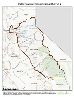 El 4.º distrito congresional se encuentra ubicado en las coordenadas 37°58′57″N 119°55′41″O / 37.9824523, -119.9279734.