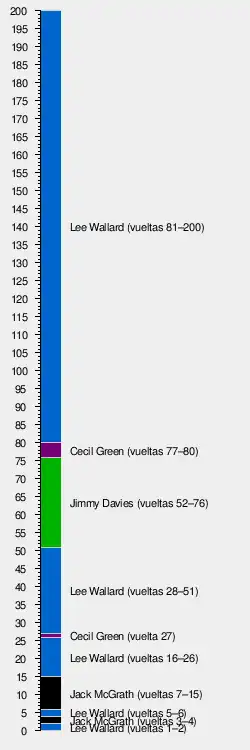 | Piloto Ganador | Fabricante Ganador | Promedio de Velocidad de competencia | Pole Position | Mayor Número de vueltas registradas como Líder |