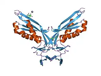 Se presenta como homohexámero formado por dos homotrímeros colocados cara a cara. El sitio activo está en la interfaz entre dos subunidades. El aceptor de protones cisteína está situado en una subunidad y el sistema de transmisión de carga en la otra subunidad. Como cofactor utiliza un ion zinc por subunidad. La enzima requiere para tener la máxima actividad la fosforilación del residuo Ser-19.[3]