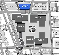 La ubicación del 7 WTC en relación con los otros edificios del complejo antes del 11 de septiembre de 2001.