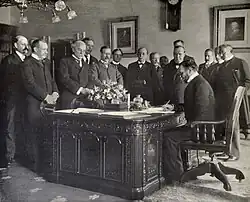 De arriba abajo, de izquierda a derecha: Alfred Dreyfus en cautiverio en el apogeo del caso Dreyfus. Comandos bóer durante la segunda guerra bóer. El Caso Plessy contra Ferguson establece la doctrina estadounidense de segregación racial , que dio lugar a las leyes Jim Crow. Casi trescientas personas de etnia lakota son masacradas por el ejército de los Estados Unidos en Wounded Knee. Firma del Tratado de París tras la guerra hispano-estadounidense de 1898, que concluye con una victoria de EE. UU. sobre España. El activismo encabezado por Kate Sheppard lleva a que Nueva Zelanda sea el primer país en otorgar a las mujeres el derecho al voto. Vincent van Gogh, el maestro neerlandés del arte moderno, muere, probablemente por suicidio. Menelik II lleva a Etiopía a una victoria arrolladora sobre Italia en la batalla de Adwa, Primera Guerra Italo-Etíope.