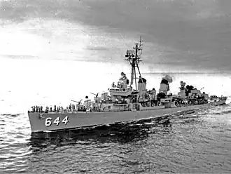 La nave fue ordenada con el TF 38 de San Pedro el 1 de julio y operada con los portaaviones ligeros en aguas japonesas hasta el 1 de septiembre. El destructor y otros destructores de la flota bombardearon Kamaishi, Honshū, el 14 de julio y, de nuevo, el 9 de agosto. El 29 y 30 de julio, bombardearon objetivos en Hamamatsu, Honshu. El 1 de septiembre, el destructor fue separado de los portaaviones ligeros y se embarcó para los Estados Unidos, llegando a Port Angeles, Washington, el 13 de septiembre. Recibió una revisión de licitación en el astillero Puget Sound Naval Shipyard en noviembre y luego navegó por la costa de San Diego. Fue dado de baja el 31 de mayo de 1946, y se unió a la Flota de Reserva del Pacífico.