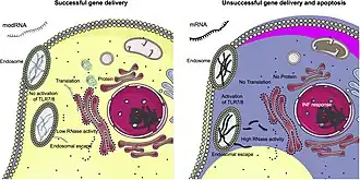 Izquierda: la entrega del gen mediante el modARN tiene éxito al no provocar la activación de la respuesta inmune y escapa de la degradación mediante Ribonucleasa.