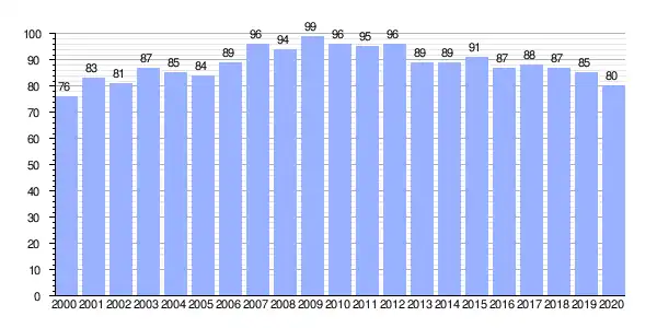 | Gráfica de evolución demográfica de A Moniña entre 2000 y 2020 |