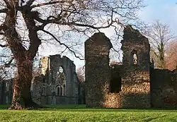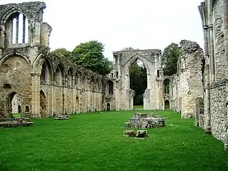 El núcleo central del monasterio estaba rodeado por un recinto que contenía un patio exterior (público) y un patio interior (privado), jardines, establos, casas de huéspedes para los viajeros, estanques de peces, la casa-granja y edificios industriales. El sitio fue defendido por un gran banco y fosa, parte del cual sigue estando al este de la abadía. La entrada estaba estrictamente controlada por una "casa del guarda" o gatehouse de entrada exterior e interior.[32] Una capilla, conocida como "capella ante portas" (del latín: capilla fuera de las puertas) fue colocada por fuera de la puerta de entrada para el uso de los viajeros y de la comunidad local. De los edificios del recinto, la casa del abad, el foso y los estanques de peces han dejado restos visibles.[33][34]