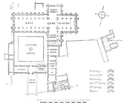 Al sur de la iglesia se encuentra el claustro, rodeado de edificios en tres de sus lados y la iglesia formando el cuarto. El claustro era el corazón de la abadía, donde los monjes pasaron la mayor parte de su tiempo cuando no estaban en la iglesia, participando en el estudio, la copia de libros y la creación de manuscritos iluminados.[14][15] Los escritorios de los monjes fueron colocados al pie norte del claustro, y un armario para libros fue tallado en la pared externa del ala sur del transepto.[15]