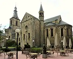 La iglesia abacial románica es una iglesia orientada de planta basílical en cruz y consta de una nave central y dos naves laterales con alzado basilical, un transepto, dos pseudotranseptos, un coro redondo cerrado en forma de trébol y una cripta. El westwerk es alta con una torre central rectangular, que lleva una aguja barroca con una linterna. Tanto el coro como el claustro son neorrománicos.