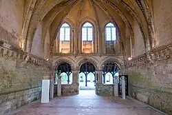 La sala capitular conservada está incrustada en el nuevo edificio y los revestimiento del exterior no permiten ver más que las arcadas góticas; los mauristas, por medios muy pronunciados, rehicieron los viejos tramos a los nuevos por el bien de la simetría y del orden.[16] Se ven en el piñón las huellas de las escaleras que servían a los dormitorios y a otros lugares de la vida.