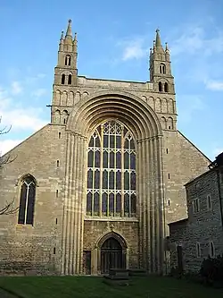 La fachada occidental románica consiste en un muro rectangular rematado por dos torretas cuadradas cubiertas con techos cónicos de piedra. Una enorme arcada románica está atravesada por una ventana de estilo gótico perpendicular.