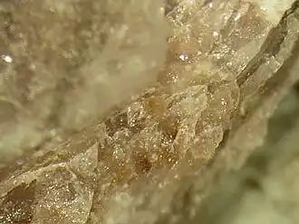 Se encontró embebido como cristales aislados en xenolitos de roca sienita con sodalita.