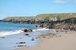 En las cumbres de las colinas que salpican los cabos hay brezos and retamos espinosos, dados forma por el predominante viento. Clavelinas del mar and serpillos salvajes prosperan sobre el ácido suelo. Los acantilados son una fortaleza de las chovas piquirrojas y un lugar donde anidar para alcas tordas y araos comunes. En las rocas más bajas, al alcance de las olas, hay gran cantidad de líquenes, macroalgas, esponjas, lapas y cirrípedos.[96]