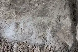 - Escena con tres cuadrúpedos pintados en negro encima de una capa blanquecina. Sobre uno de ellos se superpone una figura humana en color rojo con los brazos en aspa.