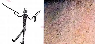 La figura menos apreciable posee tocado y parece hallarse en actitud de danza. Del conjunto, cabe destacar los bumeranes: