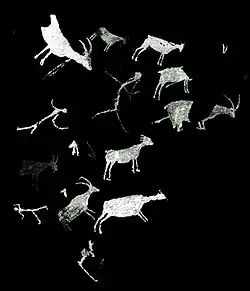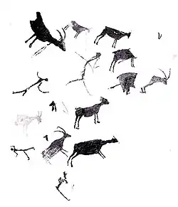 - Panel I: en un espacio de menos de un metro cuadrado (52cm x 60 cm a 170 cm del piso de la cueva) se representan hasta catorce motivos pintados (en blanco sobre fondo negro) bien conservados, que figuran una escena de caza de gran dinamismo. Los zoomorfos (9 cabras) se han representado en distintas actitudes: estática, a la carrera, con las patas flexionadas (heridas o muertas), algunas con flechas clavadas. Los animales poseen rasgos anatómicos muy definidos: cornamenta en perspectiva biangular, orejas, pezuñas, corvas..., manifestando gran naturalismo, no obstante algunos detalles anómalos (cuello muy largo, cabeza pequeña). La escena se completa con cinco antropomorfos, que participan del actividad del conjunto, corriendo tras los animales, algunos portando arcos..., su principal característica es la estilización y sin tratamiento anatómico preciso, más allá de cuerpos ensanchados en la parte correspondiente a los hombros, cabeza globular/alargada, extremidades reducidas a simples trazos. No obstante el esquematismo, los antropomorfos muestran un cuerpo proporcionado (cuerpo, cabeza, extremidades), dotando al conjunto de gran dinamismo.[9]
