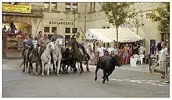 Para que este recorrido transcurriera sin incidentes, el bioù o buòus ("toro o toros" en provenzal) eran guiados por una docena de jinetes dispuestos en forma de V.