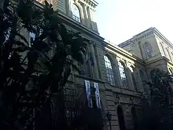 La fachada principal, decorada con los bustos de personalidades relacionadas con la academia, está dotada de una amplia entrada, a la cual se accede mediante una ancha escalinata rodeada por dos leones de bronce esculpidos por Tommaso Solari. Excepto estos detalles, todo el edificio está construido en tufo amarillo campano.