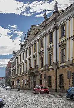 El edificio monumental de la Academia, uno de los monumentos más significativos del barroco austríaco en el territorio de la Polonia contemporánea, fue erigido entre 1726 y 1738, según el proyecto del arquitecto de Viena Joseph Emanuel Fischer von Erlach, y resistió la Segunda Guerra Mundial. Después de 1945 estaba devastado sistemáticamente ya que servía como uno de los muchos cuarteles de las tropas soviéticas estacionadas en Legnica y sus alrededores. No fue hasta 1978 que la parte soviética entregó las instalaciones a la parte polaca. La renovación de la Academia de Caballeros terminó oficialmente a finales de marzo de 2016.[1]