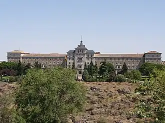 Al acabar la guerra, la Academia de Infantería estuvo instalada provisionalmente en Zaragoza, en el edificio de la Academia General Militar, y en Guadalajara, en la sede del colegio de las Adoratrices.[7] A partir del curso 1948–1949 regresó a Toledo, a un edificio de nueva construcción, obra de los ingenieros militares teniente coronel Manuel Carrasco Cadenas, teniente coronel Arturo Ureña Escario y teniente coronel Julio Hernández García. En su construcción, que duró seis años, participaron trabajadores forzados dependientes del Patronato para la Redención de Penas por el Trabajo.[8] El edificio, de estilo neorrenacentista y neoherreriano, armoniza bien con el Alcázar, situado justo en frente.[9]