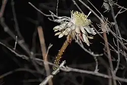 Produce flores blancas que florecen por la noche y se cierran durante el día. Las flores tienen forma de embudo y pétalos largos y delgados que les dan una apariencia elegante.