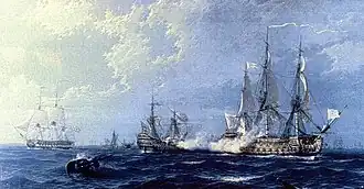 ![]() Navío de línea español Princesa enfrentándose a los navíos británicos Oxford, Lennox y Kent. Obra de Ángel Cortellini Sánchez. | ||||