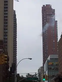 Este impacto causó un incendio en los pisos 40 y 41, que tardó más de una hora en sofocarse.[4] Dos personas resultaron fallecidas,[5] el pitcher de los New York Yankees Cory Lidle y el instructor de vuelo Tyler Stanger. El avión impactó en los pisos 40 y 41 de una torre de departamentos residenciales construida en 1988,[4] conocida como Belaire Aparments. Este edificio contiene 183 departamentos, algunos evaluados por encima el millón de dólares. Tres departamentos de la torre quedaron totalmente destruidos por el incendio que provocó el impacto.