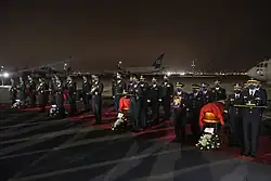 Los cuerpos de los militares fallecidos fueron recibidos con honores militares en la Base Aérea del Callao por el presidente del Consejo de Ministros Vicente Zeballos, por el ministro de Defensa Walter Martos Ruiz, por el comandante general de la FAP Rodolfo García Esquerre, así como por el jefe del Comando Conjunto de las Fuerzas Armadas César Astudillo Salcedo, el comandante general del Ejército Jorge Céliz Kuong y el comandante general de la Marina Fernando Cerdán Ruiz .[8]