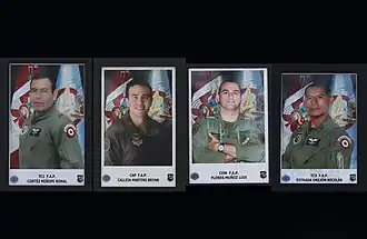 - Capitán FAP Bryan Steve Calleja Martins. Oficial graduado como Espada de Honor de su promoción. Contaba con experiencia en evacuaciones aero médicas en emergencias por terremotos y durante el fenómeno de El Niño que azotó la costa peruana en 2017.[8]