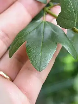 Es un árbol de hoja perenne o semiperenne, arbusto o pequeño árbol que alcanza un tamaño de 10 m de altura con un tronco con un diámetro de 50 cm. La corteza es de color gris oscuro, lisa en los árboles jóvenes, formando escamas y fisuras superficialmente en los árboles maduros. Los brotes son de color verde en un primer momento, convirtiéndose en marrón opaco en el segundo año. Las hojas son opuestas, duras y coriáceas en la textura, de 1 a 4 cm de largo y 1 a 3 de ancho, de color verde oscuro brillante, simples o con tres lóbulos. Los lóbulos tienen el margen entero. Las flores son de color amarillo-verdoso, producidas en pequeños corimbos colgantes. El fruto es una doble sámara con dos redondas semillas aladas, las alas de 1,5-3 cm de largo, se extienden en un ángulo agudo.[4][5][6]