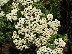 Esta especie tiene las flores de color blanco, y se asemejan a Achillea millefolium, excepto porque tiene más flores que son más pequeñas y el follaje es mucho más fino con un fino encaje compuesto en las hojas. El follaje, de color verde medio, forma un macizo de bajo crecimiento a principios de la primavera y en fines de la misma, en la floración producen tallos que crecen hasta las 50 cm de altura, los tallos terminan en grupos de flores planas. El follaje y los tallos están cubiertos de pelos suaves, llamados pubescentes.