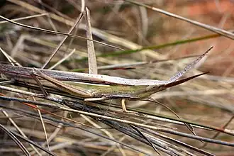 - ↑ En inglés es conocido como long-headed toothpick grasshopper.