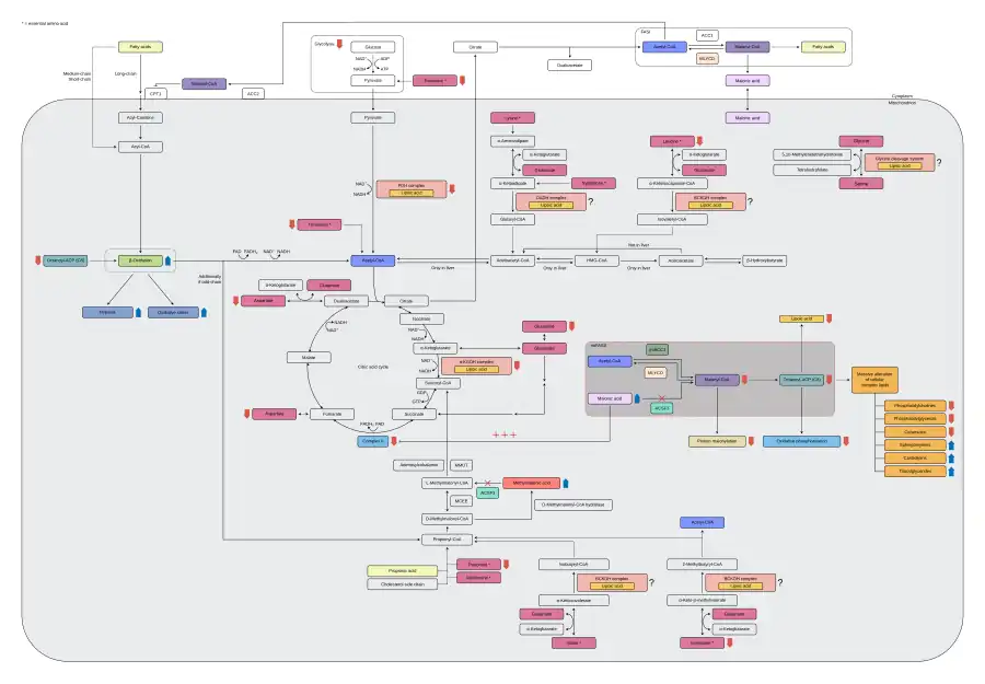La deficiencia de ACSF3 en la CMAMMA conduce a una acumulación de ácido malónico y a una deficiencia mitocondrial de malonil-CoA.[13] Mientras que el ácido malónico inhibe competitivamente el complejo II y tiene un efecto citotóxico, la deficiencia del sustrato malonil-CoA conduce a su vez a una menor malonilación de las proteínas mitocondriales, lo que afecta a la actividad de las enzimas metabólicas y altera el metabolismo celular.[13] Sin embargo, la demanda de malonil-CoA todavía puede satisfacerse en parte a través de la enzima mtACC1, una isoforma mitocondrial de ACC1, lo que explica el amplio fenotipo clínico de la CMAMMA.[14] Las deficiencias de intermediarios pueden continuar hasta el principal producto de la mtFASII, el octanoil-ACP, que se requiere como sustrato de partida para la biosíntesis del ácido lipoico, para el ensamblaje de los complejos de la fosforilación oxidativa y como sustrato endógeno para la β-oxidación.[4] Importantes complejos multienzimáticos mitocondriales como los del metabolismo energético, el complejo piruvato deshidrogenasa (PDHC), el complejo α-cetoglutarato deshidrogenasa (α-KGDHC) y los del metabolismo de los aminoácidos, el complejo alfa-cetoácido deshidrogenasa de cadena ramificada (BCKDHC), el complejo oxoadipato deshidrogenasa (OADHC) y el sistema de escisión de la glicina (GCS), dependen del ácido lipoico como cofactor covalente para su funcionalidad.[15][16] Como consecuencia, la lipoilación reducida del complejo piruvato deshidrogenasa y del complejo α-cetoglutarato deshidrogenasa conduce a un flujo glucolítico reducido, medido en glucólisis y capacidad glucolítica.[4] Para compensar probablemente la demanda energética de la célula, se detectó un aumento de la β-oxidación de ácidos grasos y una disminución de la concentración de aminoácidos que alimentan anapleróticamente el ciclo de Krebs, como el aspartato, la glutamina, la isoleucina, la treonina y la leucina.[4] En resumen, la reducción de la respiración mitocondrial y del flujo glucolítico da lugar a un deterioro de la flexibilidad mitocondrial con una gran dependencia de la β-oxidación de los ácidos grasos y un mayor consumo de aminoácidos anapleróticos.[4][14]