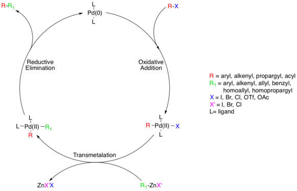 Tanto los haluros de organozinc como los compuestos de diorganzinc pueden usarse como materiales de partida. En un sistema modelo, se encontró que en el paso de transmetalación, el primero da el aducto cis R-Pd-R ', lo que resulta en una rápida eliminación reductora del producto, mientras que el segundo da el aducto trans que tiene que pasar primero por un proceso de isomerización trans-cis lento.[13]