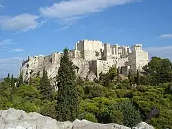 - ↑ Acrópolis de Atenas: en griego antiguo: ἡ Ἀκρόπολις τῶν Ἀθηνῶν hē Akrópolis tôn Athēnôn; en griego moderno: η Ακρόπολη της Αθήνας i Akrópoli tis Azínas, o: η Ακρόπολη Αθηνών i Akrópoli Azinón.