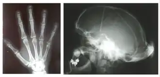 ![]() Síndrome de Hajdu-Cheney: acroosteólisis de todas las falanges distales, platibasia, hueso occipital engrosado, suturas abiertas. | ||