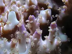- Coralitos radiales: coralitos periféricos a los lados de las ramas, o entre los coralitos axiales de Acroporas con forma de crecimiento incrustante o plato. Los coralitos están distribuidos muy compactos en la superficie de la colonia, tienen entre 2 y 3 mm de ancho, y sobresalen 2-3 mm de la superficie de las ramas.[7]