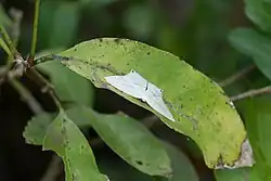 Las alas son blancas con un borde color crema. La larva es de forma fusiforme, de cuerpo translúcido.[2] Las plantas huéspedes son especies de Dregea (Apocynaceae).[3]