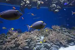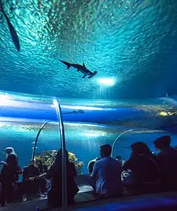 Esta sección contiene el mayor acuario de Planeta Azul, el tanque Oceánico, de 4.000.000 litros.[1] Alberga tiburones (tiburón cebra, tiburón de arrecife de puntas negras, tiburones alfombra y tiburones martillo jóvenes), rayas, rayas águila, peces guitarra, morenas, jureles dorados, meros y otros animales que pueden verse a través de la ventana principal de 16 por 8 m, que tiene un grosor de 45 cm. También hay un túnel para tiburones de 16 m de largo.[22][23][24] Frente al tanque oceánico se encuentra el arrecife de coral de 16 m de largo con corales vivos y peces de arrecife.[25] También hay varios acuarios más pequeños con especies como el pez camarón, el dragón marino, los caballitos de mar, un acuario mediterráneo[10] y el pez piedra, el pez león y la serpiente de mar oliva, que son muy venenosos.[26]