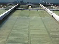 Decantación: En esta etapa se produce la separación de los flocs formados en la etapa anterior, los que, al ser más densos que el agua tienden a sedimentar hacia el fondo de los decantadores simplemente por acción de la gravedad, eliminándose de esta manera la mayor parte de la carga de partículas presentes en el agua cruda. El sistema está conformado por ocho decantadores convencionales de flujo horizontal y de gran capacidad volumétrica que funcionan en paralelo; el agua decantada se recoge por medio de vertederas instaladas al final de cada uno de los decantadores.
