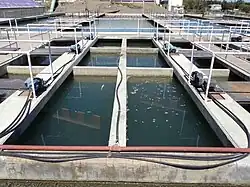 Decantación: Esta es la etapa del proceso en la que existen diferencias más marcadas entre las dos plantas potabilizadoras. El sistema de decantación de esta planta se encuentra constituido por seis decantadores de flujo laminar, también llamados de alta tasa, del tipo de placas planas paralelas inclinadas a 60°. Este tipo de diseño conceptual presenta algunas ventajas frente a los decantadores de tipo convencional, siendo la principal el aumento de eficiencia en la decantación producida por la presencia de las placas, lo que permite trabajar con mayores velocidades de flujo que dan como resultado instalaciones de tamaño muy reducido si se las compara con los sistemas de flujo convencional.