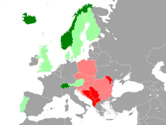 En la década de 2010, los Balcanes Occidentales realizaron el 67% de su comercio económico con la UE; Para Moldavia, la UE representa el 49% de su comercio exterior;[15] Este predominio del comercio con los países de la UE se observa también en la Inversión extranjera directa, que procede principalmente de países de Europa occidental en dirección "de países desarrollados a países en desarrollo". El comercio intrarregional dentro de una región subdesarrollada en comparación con los países de Europa occidental sigue siendo modesto y explica en parte el renovado apoyo de la Comisión Europea para estabilizar y desarrollar la región a través de su estrategia para los Balcanes Occidentales implementada en 2017.[16]