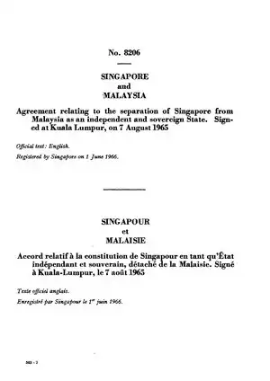 Y CONSIDERANDO que, mediante un Acuerdo celebrado el 7 de agosto de mil novecientos sesenta y cinco entre el Gobierno de Malasia, por una parte, y el Gobierno de Singapur, por otra, se acordó que Singapur dejara de ser un Estado de Malasia y debería convertirse en un Estado y una nación independientes y soberanos separados e independientes de Malasia;